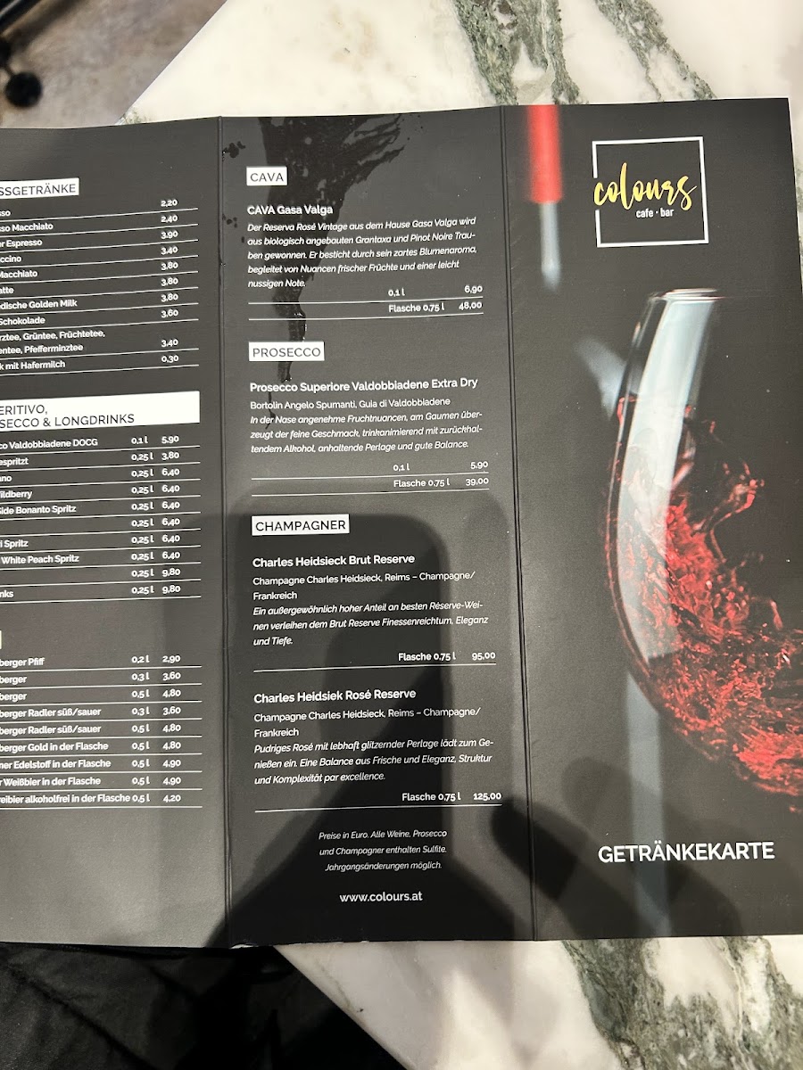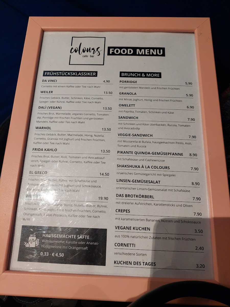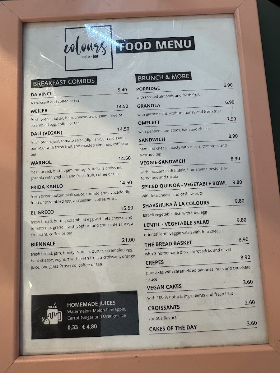 The menu at Colours Bar.bistro, located at Innstraße 1, 6020 Innsbruck, offers a delightful variety of dishes that cater to a range of tastes. One of the standout items is the Frühstück Frida Kahlo, a hearty breakfast that brings a vibrant start to the day. Perfect for those craving a fulfilling meal, it’s a great way to energize before exploring the city.
